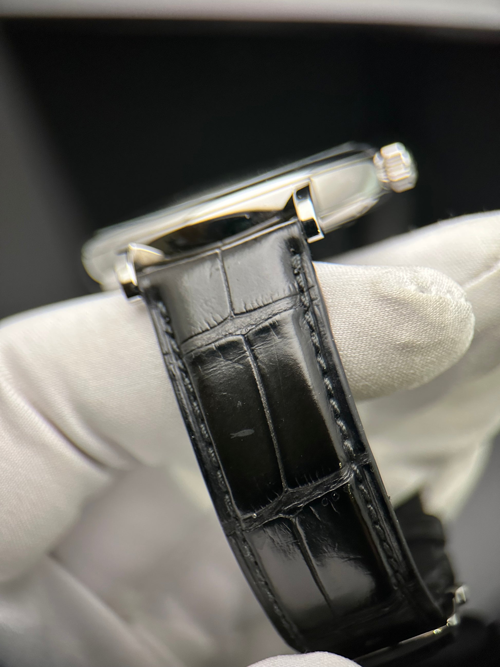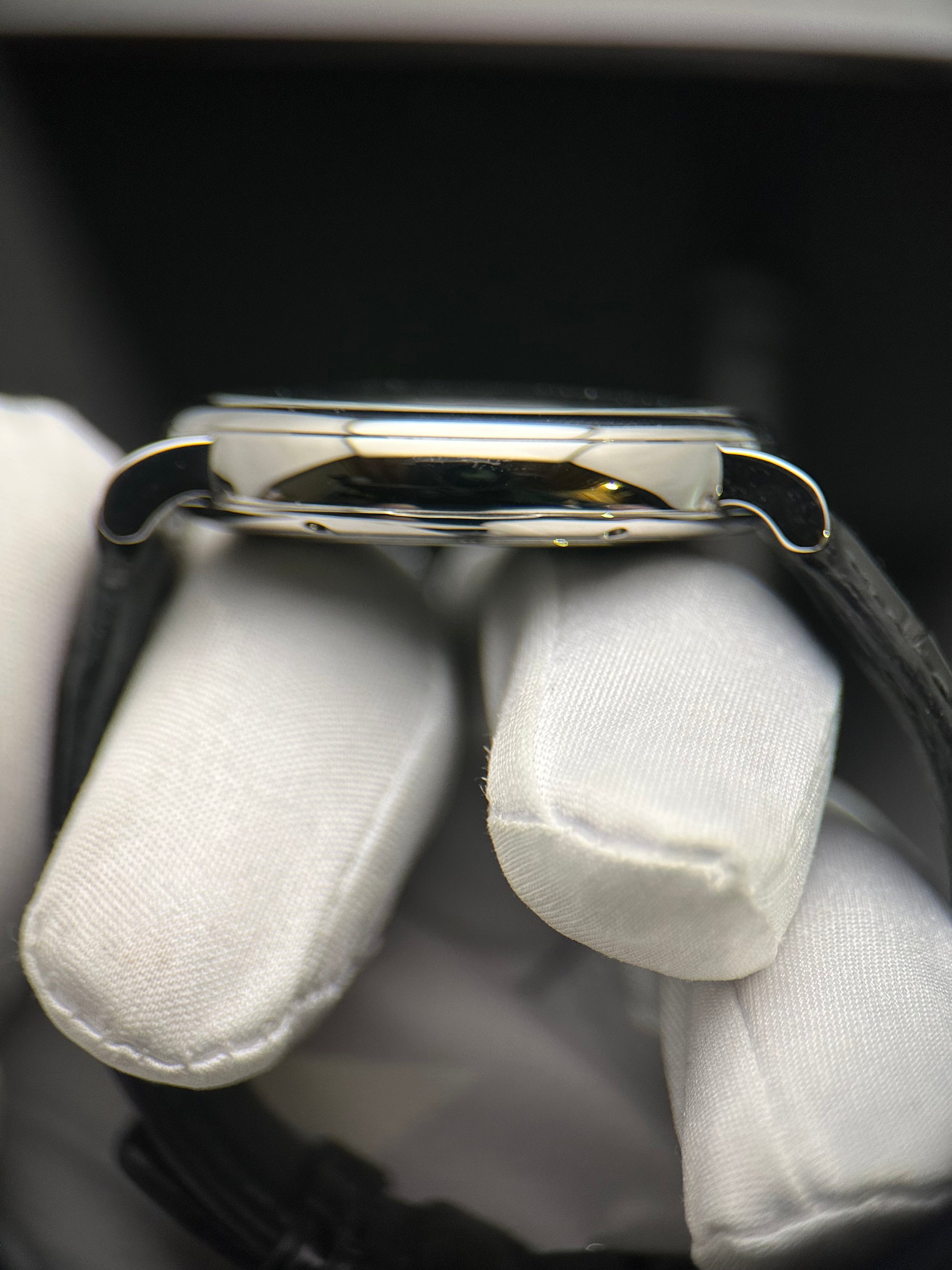 features a 40mm stainless steel case, 9.5mm thick, with a polished finish and a solid case back with a 42-hour power reserve and 28,800 vph frequency, offering hours, minutes, seconds, and a date window at 3 o’clock.